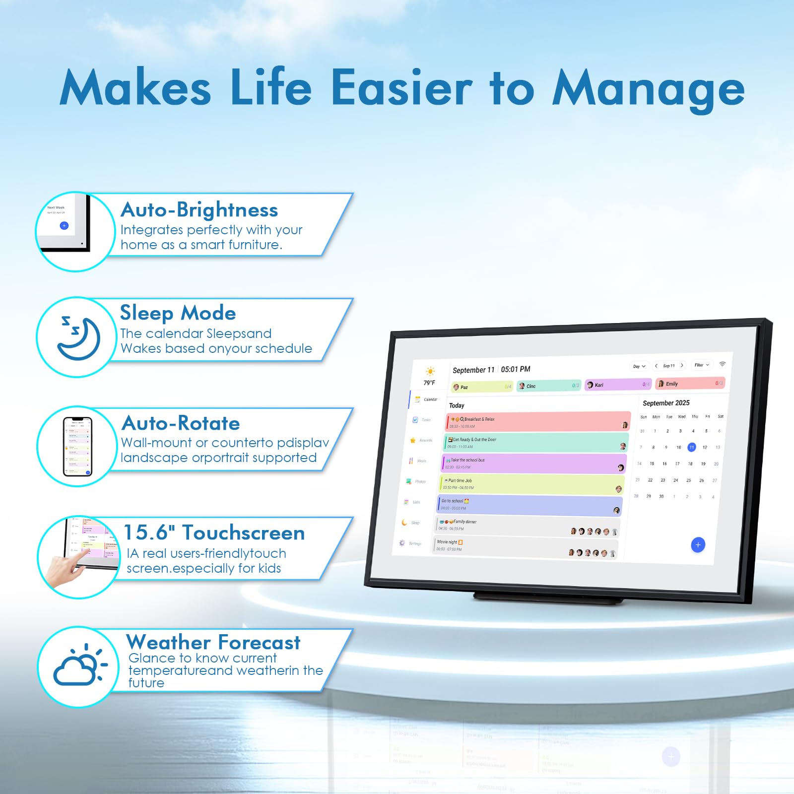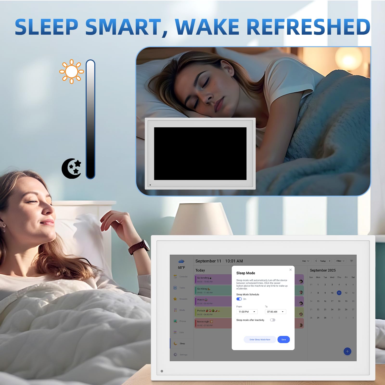 - 4️⃣ 【🌙 Smart Sleep Mode & Digital Photo Frame】This digital calendar serves as your family's command center. When idle, it automatically transforms into a digital photo frame, displaying cherished memories in slideshow mode. Perfect as both a functional desk calendar and decorative electronic calendar! Customize sleep schedules (auto on/off) to match your family's routine.