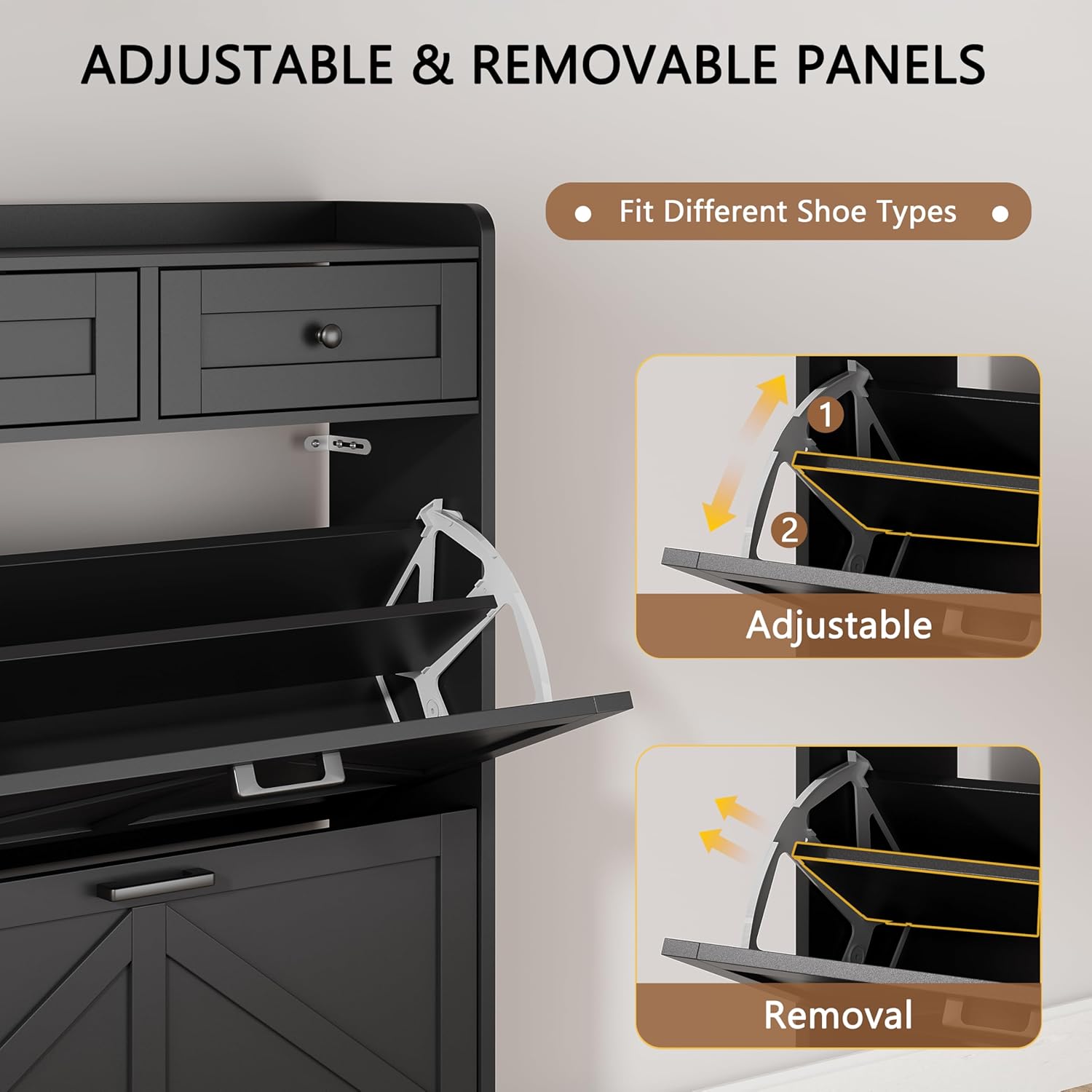 - 【Multipurpose Shoe Cabinet】The entryway shoe cabinet is versatile and can accommodate different types of shoes, including heels, sneakers, flats, and boots. Each flip-out drawer features an ADJUSTABLE or REMOVABLE panel in the middle, allowing you to customize the storage space based on the size and shape of your shoes