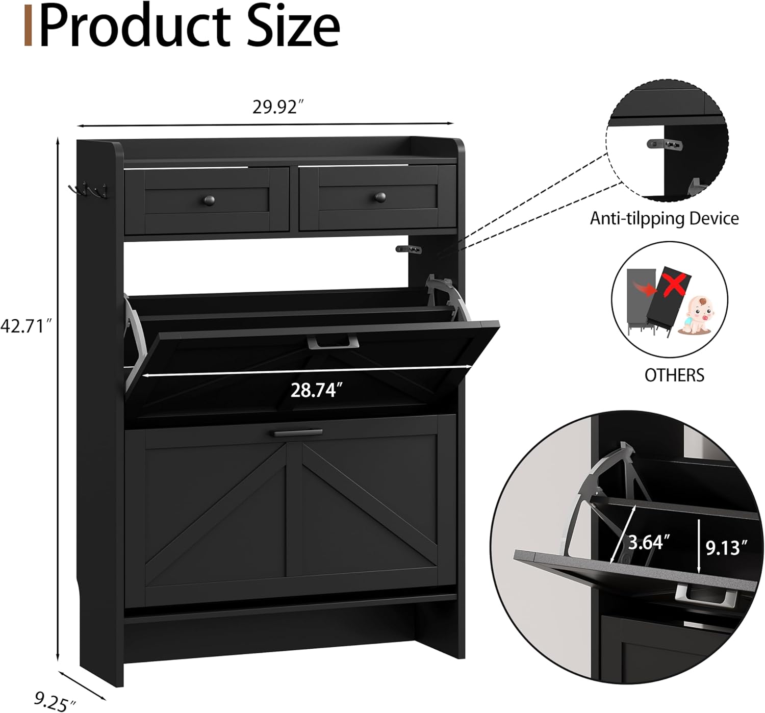 - 【Large Capacity】Measuring 29.92"x 9.25"x 42.7", the shoe organizer cabinet can hold about 12-16 pairs of shoes. It is equipped with 2 flip-out drawers, each flip drawer has two layers. The 2 sliding drawers are ideal for accessories, keys, and wallets, providing easy access to items. The open storage space on top is for photo frames, decorations, and plants. Two side hooks perfect for hanging umbrellas or coats
